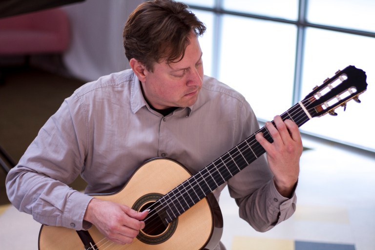 Grammy-winning guitarist (and cover subject of the Summer 2015 issue of Classical Guitar) Jason Vieaux stopped by our offices to play some Bach and a fantastic arrangement of the pop standard ‘What a Wonderful World’ for Acoustic Guitar Sessions. We’ll be posting that video in the not-too-distant future. That lovely guitar is a custom model built by German luthier Gernot Wagner. (Photo by Joey Lusterman)