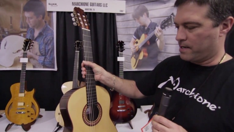 Designer and builder Stephen Marchione of Marchione Guitars in Houston, Texas, discusses two of his handcrafted instruments: a 16-inch archtop (with high-grade Engelmann spruce top, European maple back and sides, ebony fretboard, and handwound pickup) and a classical model. “My Classical design combines the ease of playability and tonal accuracy of a Gilbert guitar, the warmth and richness of tone of a Fleta, and the power and projection of a Rodriguez Jr. guitar from the 1970s,” Marchione notes.