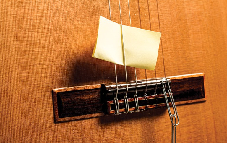 Paper, inert putty, and pipe cleaners are all safe for your guitar’s finish, while also yielding dramatic timbral results: Try affixing a pipe cleaner to a string, and then moving it to different positions to hear the difference. Small variations in the density, weight, and placement of the object are all going to affect the resulting tone in surprising ways.