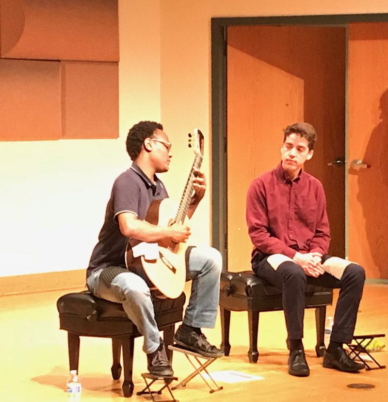 Over at the more intimate Clarke Hall on June 19, Raphaël Feuillâtre and Xavier Jara (respective winners of the 2018 and 2016 ICAC) managed to enthrall a nearly full auditorium of folks at a Luthier Showcase in which they demonstrated the sound of 22 different guitars from the Luthier Fair which took place in the nearby School of Music Building. I’d never seen one of these demos before. For each guitar, Xavier would play a short (roughly one-minute) passage, then hand the guitar to Raphaël, who played a different passage. They played the same two passages for each of the instruments, as the audience followed along on lists of the guitars, which were not identified by name, only number, from the stage. They all sounded pretty good to me, but I am definitely no expert in these matters. Anyway, an interesting demonstration to witness.