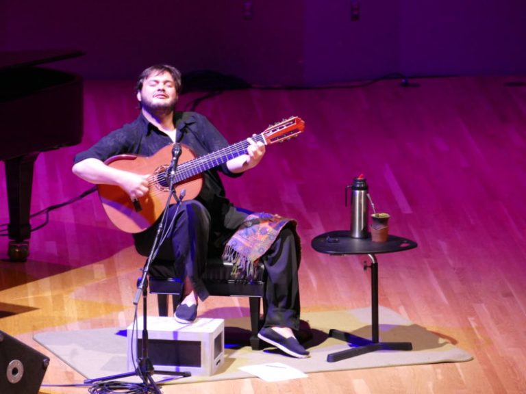 A relatively late addition to the June 18 concert roster at GFA (because another artist had travel/visa issues) was the extraordinary Brazilian seven-string guitar master Yamandu Costa, featured in what was billed as “An Evening of Performance and Conversation,” spearheaded by the dean of the Frost School of Music, Shelly Berg, himself a well-known (multiple Grammy-nominated) pianist, arranger, orchestrator, and producer. The program, which several folks raved to me about when I arrived the next day, included an onstage interview conducted by Berg, with lots of talk and demonstrations about technique and styles of Brazilian music, the two musicians playing together some, and of course Yamandu commanding the stage alone in his inimitable way. If you’ve ever seen him perform live (I have, in San Francisco) you know what a magnetic, spontaneous, and inspirational virtuoso he is!