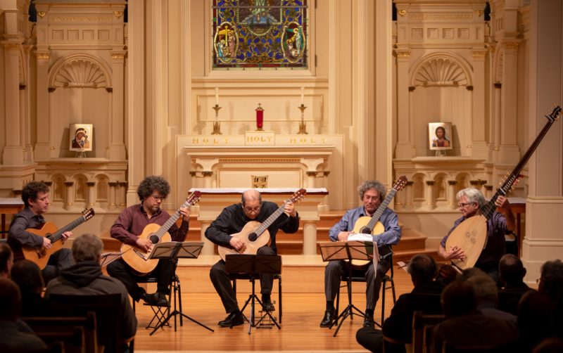 We wanted to share some nice photos and info about a great mid-April concert dubbed “The Maestros of 50 Oak Street,” featuring teachers from the guitar program of the San Francisco Conservatory of Music, held at SF’s St. Mark’s Lutheran Church. (50 Oak Street is the Conservatory’s address in the city.) The annual affair, put on by the Omni Foundation for the Performing Arts, always showcases music from many eras and styles, reflecting the varied tastes of the guitarists—each an acknowledged virtuoso.