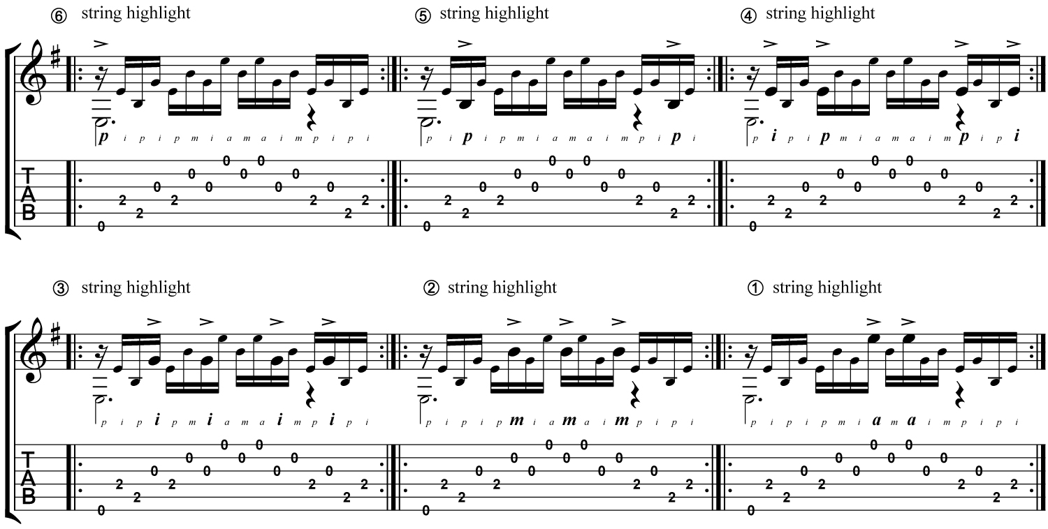Once the right-hand pattern is undisturbed and internalized, the next goal is finger independence within the sequence. This is achieved through highlighting each finger as it plays (No. 2). Highlighting does not mean accenting, thereby using more force; in fact it is the opposite—you will be subtracting force. Think of your fingers as having volume dials: Instead of turning up an individual finger—the “accent”—turn down the other three to reveal the finger. This is done in sequence, focusing on each string in turn. If primed correctly, it allows the pattern to take on a certain rhythmic swing, which will add a level of authentic sophistication to any interpretation.