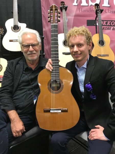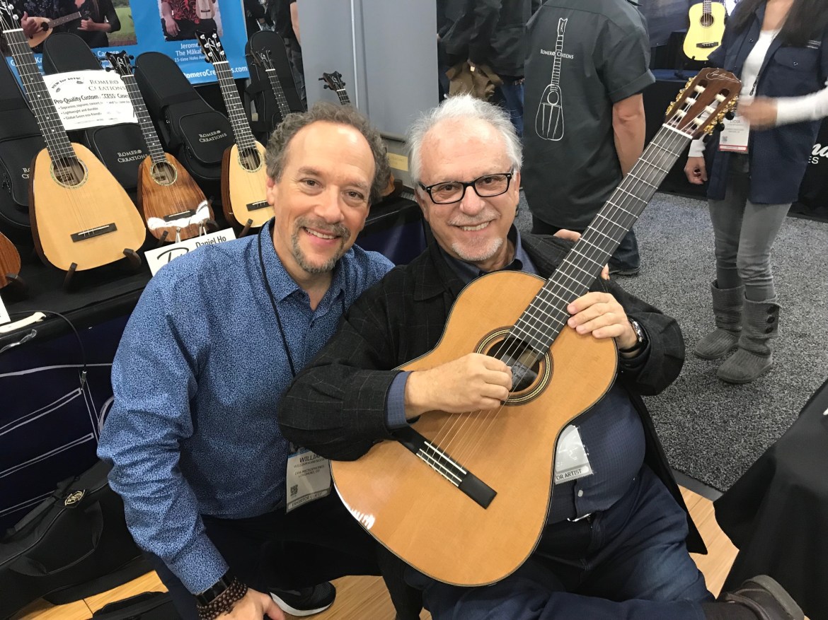 Above, Southern California-based luthier Pepe Romero Jr. (featured in a profile story in the Winter 2018 issue of CG) shows off one of his new line of economical classicals that are made in Vietnam, but boast the same design ideas he incorporates in his much-sought-after top-of-the line guitars that come from his shop. And, as has become a tradition, Pepe Jr”s illustrious guitarist father, Pepe Romero (who aided in the original design of the classical model) dropped by to hang out at the Romero Creations booth (where they were showing ukuleles and classical guitars) to chat with folks and also play a little. Below, that’s Pepe Sr. on the right, with his good friend Bill Kanengiser of the LAGQ.