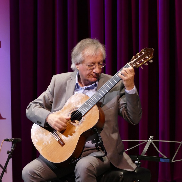 But when Pierri came onstage at the appointed time, he explained he was going to change “a couple of things” in the program. He hadn’t been feeling well: “A recommendation to my colleagues,” he said quietly, “Please don’t eat the food on the plane,” adding, “Maybe I am less a couple of kilos now,” and then he chuckled. So I presumed the program changes were to accommodate his diminished health in some way. He did appear a little pale and unsteady at first, but once he started playing, anything that ailed him was clearly brushed to the side, and he was truly magnificent. And he didn’t just change “a couple” of pieces in the program; he changed everything! In place of the Robinson dances, he played a courtly fantasia by Francesco da Milano (similar era, at least), with his guitar capo’d at the fourth fret, and sounding honey-sweet. The planned Sor sonata gave way to Paganini’s Grand Sonata, Pierri’s fingers dancing with apparent ease up and down the fretboard, and then Sor had his day, as Pierri unfurled a splendid take on the demanding Grand Solo, Op. 14. He closed the first half with a pair folk dances from the Rio de la Plata region of Uruguay, the second a relentless, driving piece that had Pierri strumming furiously with his knuckles up the neck at one point.