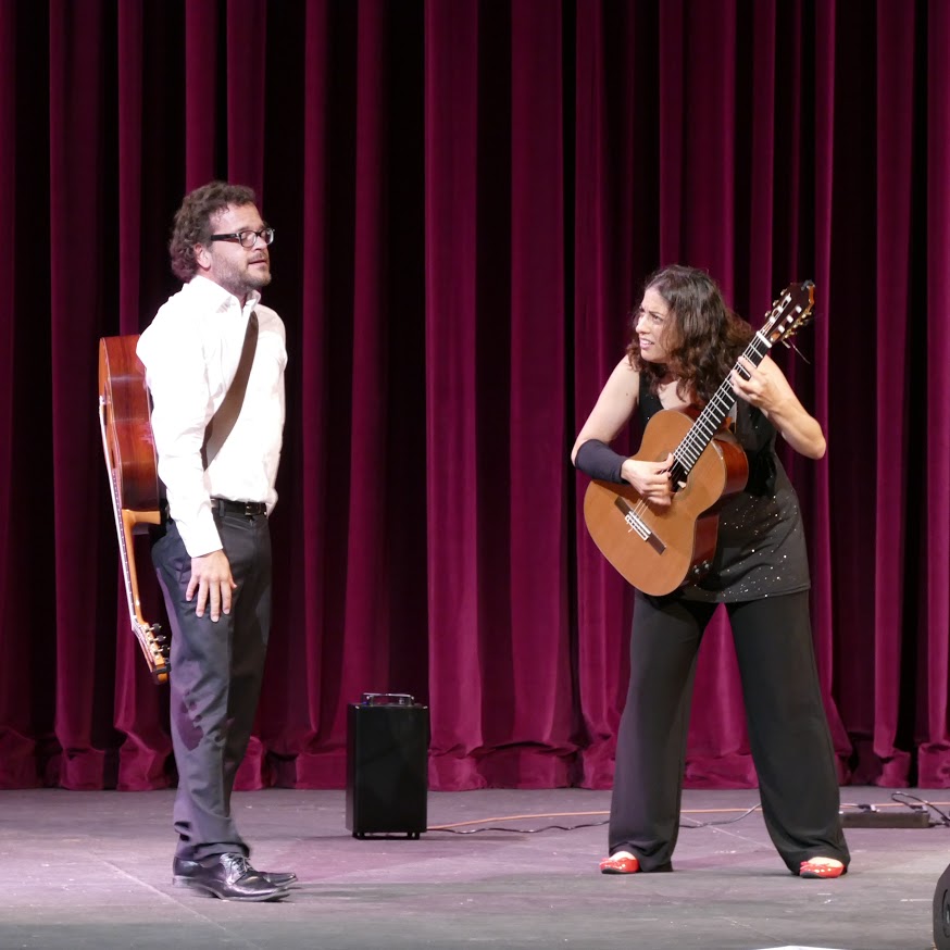 Well, now the classical guitar world has Crazy Nails—(seriously skilled) French guitarists Boris Gaquere and Gaëlle Solal, in collaboration with a co-writer/stage director/coach named Henry Debay—who premiered their slightly under one-hour stage extravaganza before a standing-room-only crowd at the Little Theatre that whooped and whistled and cheered every antic parody the duo unleashed during what I’m reasonably sure was the wildest thing ever to grace a GFA stage. It started out normally, with the duo seated onstage, playing some Vivaldi. OK, nice. Then all hell broke loose! They jettisoned the chairs, attached straps to their Jean-Luc Joie guitars, and began roaming the stage playing the Beatles’ “Blackbird.” Though unusual, this was certainly not the first time classical guitarists had stood with their instruments (see the Katona Twins, et al). But midway through the tune the true nature of this act started to emerge—they jockeyed for position at the front of the stage, each stepping in front of the other to hog the spotlight, and when Boris started whistling his “bird” accompaniment (ala Paul McCartney on the “White Album” original), Gaëlle puffed her cheeks and tried to answer with her own whistle, but kept failing to blow out more than air. If memory serves, that then morphed into a lively version of Stevie Wonder’s “Isn’t She Lovely,” with more dancing about and carrying on. Throughout, Gaëlle would speak to the audience in French and Boris would translate into English (though later that flipped).