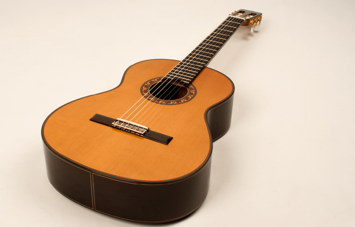 The first thing I notice about the Guitarra del Tiempo, aside from its intoxicating smell, is its impressive sustain. Whether I play open strings, fretted notes, or natural harmonics, the notes hang in the air for a long time. The guitar feels quite powerful and projective, perhaps because of its newly enhanced top bracing, and it has an obviously wide dynamic range.