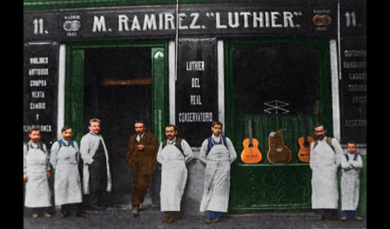 Historically, the skills in a number of different crafts have been passed down in families. In Spain, building guitars has long been a family business. By the late 19th century, some of the most prominent family guitar-building operations had sprouted from small shops around Madrid. Credit must be given to Antonio de Torres (1817–1892) and Francisco Gonzalez (1829–1879) for their contributions to the development of modern guitar design, and building the momentum into the 20th century. Refinements made by Torres—sometimes called “the father of the modern classical guitar”—are well known, but Gonzalez was also important for his “nueva y elegante forma y construidos por un sistema especial suyo” (“elegant design with a special system”) that differed from Torres’s design. The influence of these two luthiers led to the establishment of the Ramírez guitar-making dynasty, the oldest and most celebrated of the lot.