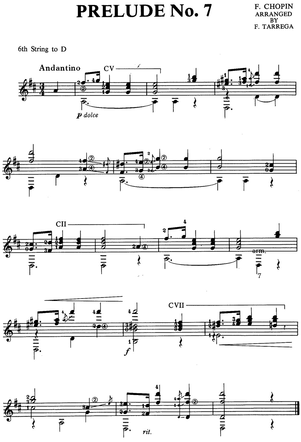 In this arrangement of the beautiful Prelude by Chopin, don’t be afraid to play quietly as indicated, using the dynamic extreme sparingly. The large chord in line 4 may be made easier if you wish by omitting the lower B (bass). My fingering uses many slides and several prepared fingers; line 3 bar 2 for example has D held by finger 2; this will slide (in advance) to F# at fret 7 in the next bar. The finger 2 is also prepared at the opening of the piece (F#). Vibrato is still effective if more than one finger is pressing on the fingerboard and this aspect of technique is worth study. (Click the image below for a larger, printable version.)