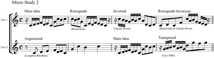 This is a single-form piece, which is structured around the opening motif, bar 1, and its contrapuntal variants: inversion, augmentation, transposition, etc. Micro Study 2 begins with the opening motif in bar 1, then varies it on the succeeding bars. And, with the exception of the transposition motif, they have all been standardized into C major for clarity. Bach makes it way more interesting in Invention No. 1, as each one of these variations can be found in some sort of guise in this piece. The fun is in finding them and working out why Bach placed them where he did, and the harmony he chose. When playing with another guitar, strive to keep clear of the other guitar’s timbre, unless it is a musical decision to become one voice. This slightly discordant micro study is perfect for testing out tone separation and clarity of parts.