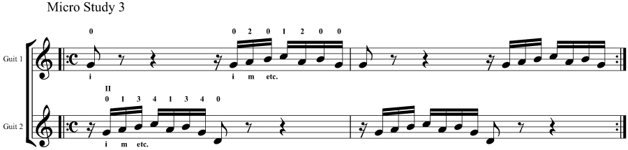 Micro Study 3 uses a motif (bar 7) to practice that 16th-note up-beat entrance. Key to getting this in the groove is to keep time. In other words, do not anticipate the beat. The tempo must be internalized and your entrance confident. That means not relying on the other guitar part to keep your time; it should be shared. Practice with a metronome on slow quarter-notes to begin with, then switch it to half-notes, so you “keep” beats 2 and 4 while the metronome keeps beats 1 and 3. This will develop your internal clock. Once all that is secure, switch the notes ’round so that you “keep” beats 1 and 3 and the metronome is on beats 2 and 4. This is a great exercise to really solidify the pulse, and your internal time keeper.