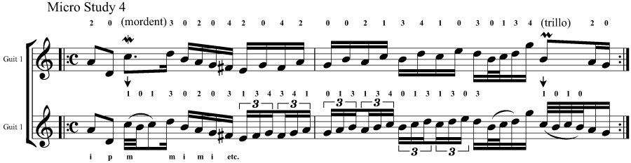 Micro Study 4 utilizes a mordent and a trillo; ornaments which Bach defined in Wilhelm Friedemann’s book, to embellish bars 5 and 6. Today, they are known as lower and upper mordents, and are performed differently. The guitar parts are the same—Guitar 1 is the original; while Guitar 2 is the florid Italianate triplet version of Invention No. 1, which lends a more improvisatory feel to the music. A modern interpretation would use a range of ornaments, especially trills on the cadences. However, I suspect that as it was the first piece of the set, Bach kept everything simple, as compared to later more heavily ornamented Inventions such as 10, 11, and 12—thus making this a great piece to begin learning Baroque-style ornamentation and improvisation.