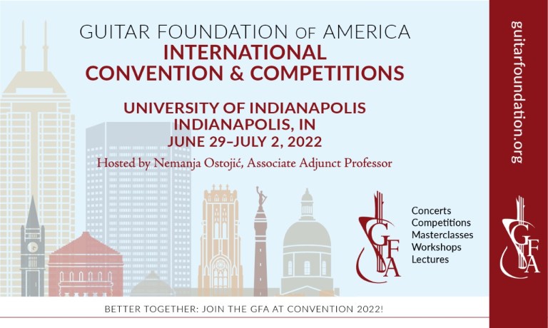 After two years of virtual and hybrid events, the Guitar Foundation of America is pleased to bring our community back together for this annual event. Please visit https://www.guitarfoundation.org/page/2022Convmain to see the most up-to-date health and safety policies set by the GFA and the University of Indianapolis.