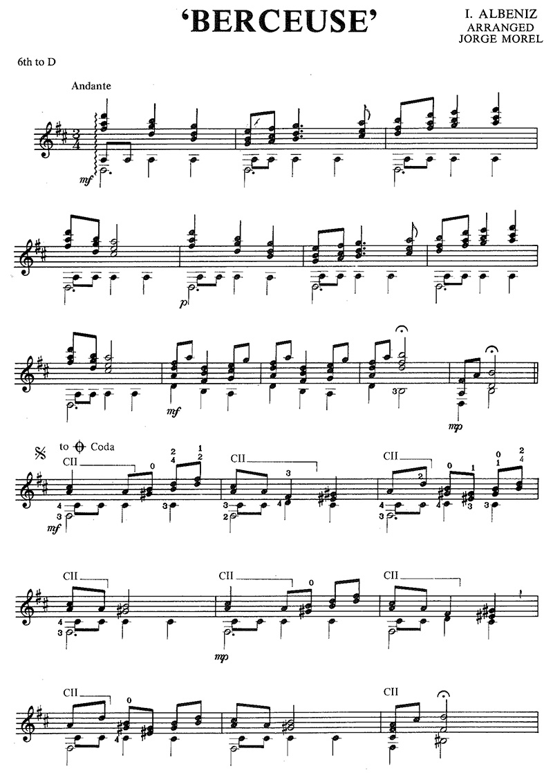 This is a most appealing arrangement for all Albéniz fans. The title (suggesting a lullaby) is the best guide to tempo, the chords at the opening should be fingered to allow smooth left hand movement. Notice the dominant pedal (a frequent device in this style of music) appearing throughout the work. Links of this type can be a great aid to the memory. In bar 39, the A would work as a harmonic if the reach to VII is difficult.