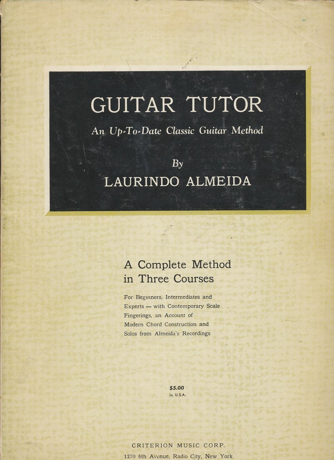 Almeida’s Guitar Tutor was one of the first serious publications to leave the purity of the traditional approach and delve into matters appropriate to players “who earn their living by studio employment in which a working knowledge of modern popular harmonic is basic.” One aspect of this was that chord symbols, hitherto absent from guitar methods, are fully explained. Almeida’s fusion of classical guitar principles with contemporary harmony opened up new territory.