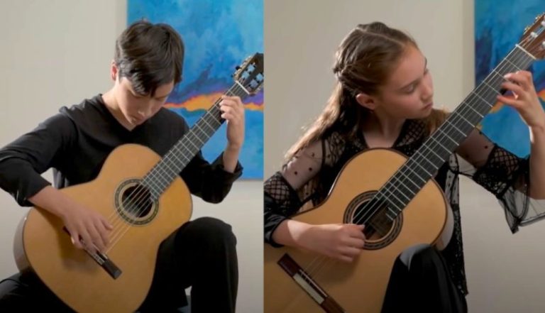 Some of you may recall that back in the spring of 2018, we posted 14 weekly videos in a series highlighting guitar prodigies. One of them featured a spirited rendition of Paolo Bellinati’s “Jongo” by the brother-and-sister Davisson Duo from the SF Bay Area: Jack, who was 13 at the time, and Elle, 10. At some point along the line I got to meet these terrific kids; nice, and as talented as can be! Now they are 15 and 12 respectively, and continuing their guitar studies with Chris Mallett at the California Conservatory of Guitar, south of San Francisco.