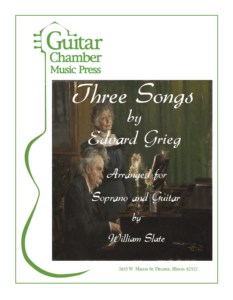 The combination of soprano-and-guitar seems to be all the rage these days, and why not?—it sounds like a natural match; a soaring, at times unearthly voice, cushioned by the clear, clean support of plucked strings. The Lyric Pieces of the prolific Norwegian composer Edvard Grieg (1843–1907) have already proven an irresistible challenge for arrangers (such as CG scribe Chris Dumigan, who has fashioned guitar duo versions of the Grieg piano Pieces for Les Productions D’Oz), so it’s not surprising that other guitarists are also exploring his vast catalog of works in interesting ways. In this booklet, American guitarist William Slate has arranged three of Grieg’s most famous songs—Jeg Elsker Dig (text by Hans Christian Andersen), Solveig’s Song (from Peer Gynt, text by Henrik Ibsin), and Våren (text by A.O. Vinje); originally Slate conceived the project as a way to be able to accompany his daughter Anna, a soprano. The lyrics are provided in the original languages (Norwegian or Danish), and also in English. The publisher notes: “Most often accompanied by a piano or occasionally a string orchestra, they sound wonderfully ‘natural’ and convincing with a guitar, as well, blending that instrument’s warmth and intimacy with the composer’s timeless melodies.”