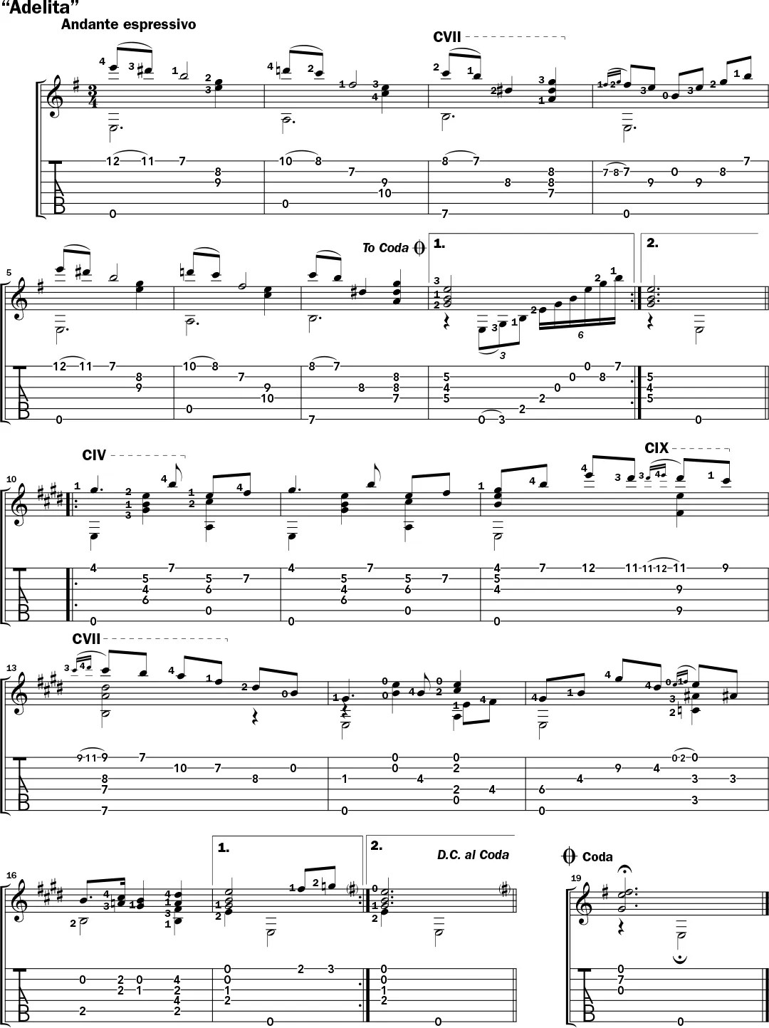 As for the fretting hand, follow the suggested fingerings throughout both pieces. Never use a barre unless otherwise indicated, as in bars 3, 10, 12, and 13 of “Adelita,” for optimal tonal clarity. And, rather than sliding your fingers on the wound strings when you shift positions, lift them off of the strings, perpendicular to the fretboard. That way, you’ll avoid a “wretched squeak,” as Chapdelaine puts it, referring to the transient sounds heard often in folk styles but considered poor form in classical playing.