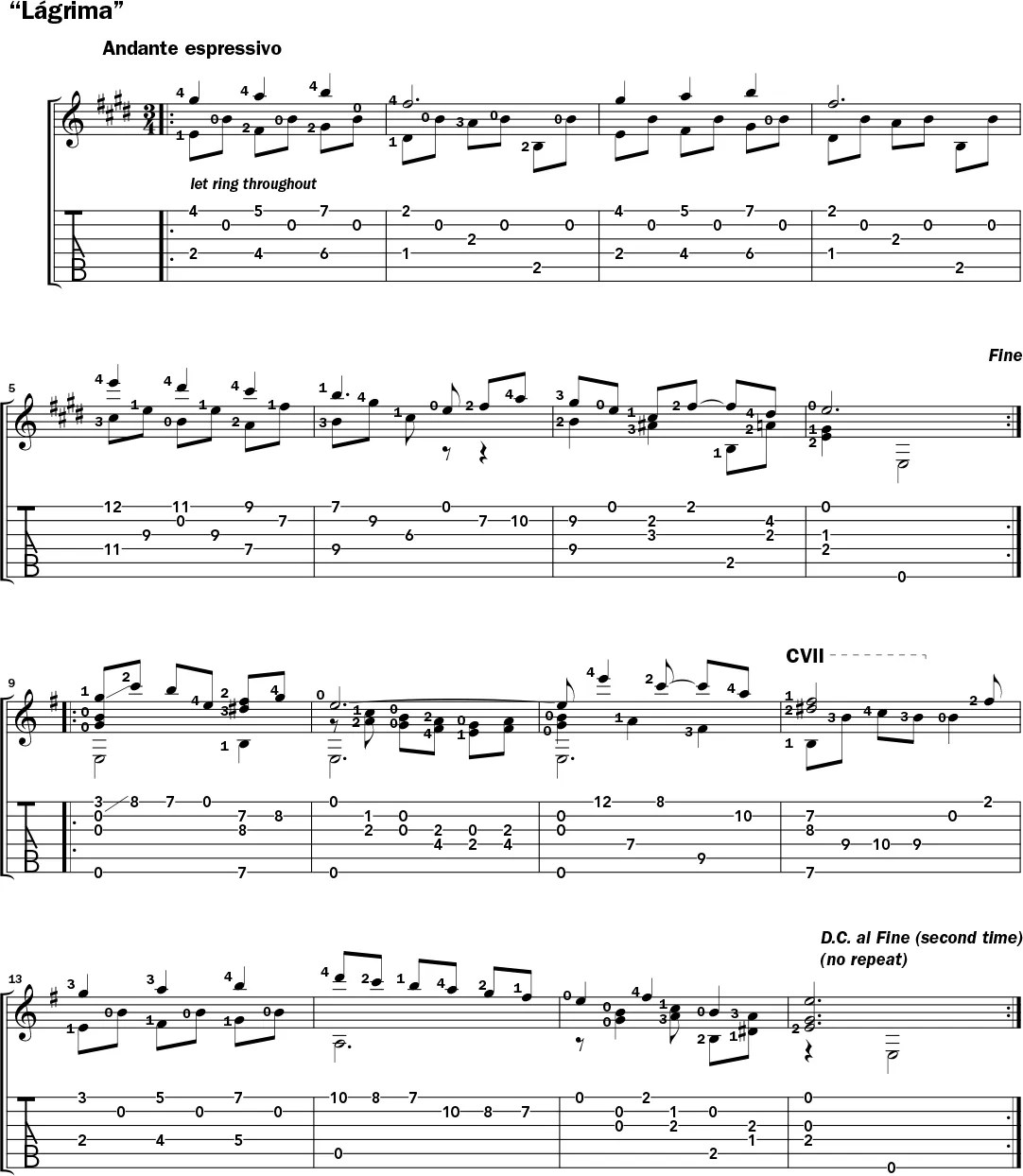 Both “Adelita” and “Lágrima” have the sort of melody-and-accompaniment texture that is common to solo guitar literature of all genres. But the melodies should be played with apoyando, or rest strokes, as opposed to the free strokes that most steel-string fingerstylists use. In playing a rest stroke, your picking finger should come to rest on the adjacent lower-pitched string as you complete the stroke. This will give the melody a firm, robust tone.