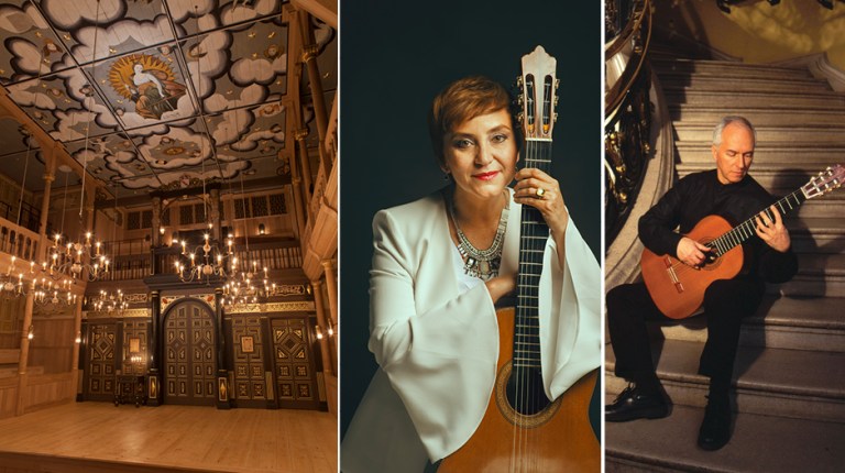 In July 21, 2018, John Williams was at the Globe Theatre in London’s Southwark Borough beside the River Thames for a concert with Paraguayan virtuoso Berta Rojas. The venue was the intimate Sam Wanamaker Playhouse, the indoor hall adjoining the open-air Globe Theatre, a replica of the venue where Shakespeare’s works were staged. Four chandeliers holding flickering candles lit the Wanamaker stage for a capacity audience of 340 seated on benches in the pit in front of the stage and in galleries at stage-level and above on either side of the stage. Every seat is close to the performers, and the hall’s acoustics are perfect for unamplified classical guitar.