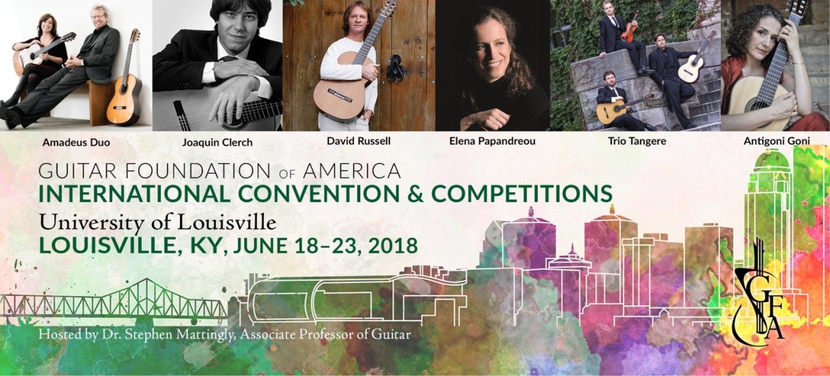 The Guitar Foundation of America will hold the 2018 GFA International Convention and Competition from June 18-23, 2018 at University of Louisville in Louisville, KY. This annual event brings together approximately 600 classical guitar masters and enthusiasts from all over the world, including some of the most elite performers of classical guitar. The 2018 GFA International Convention and Competition will be hosted by UofL guitar faculty Stephen Mattingly.